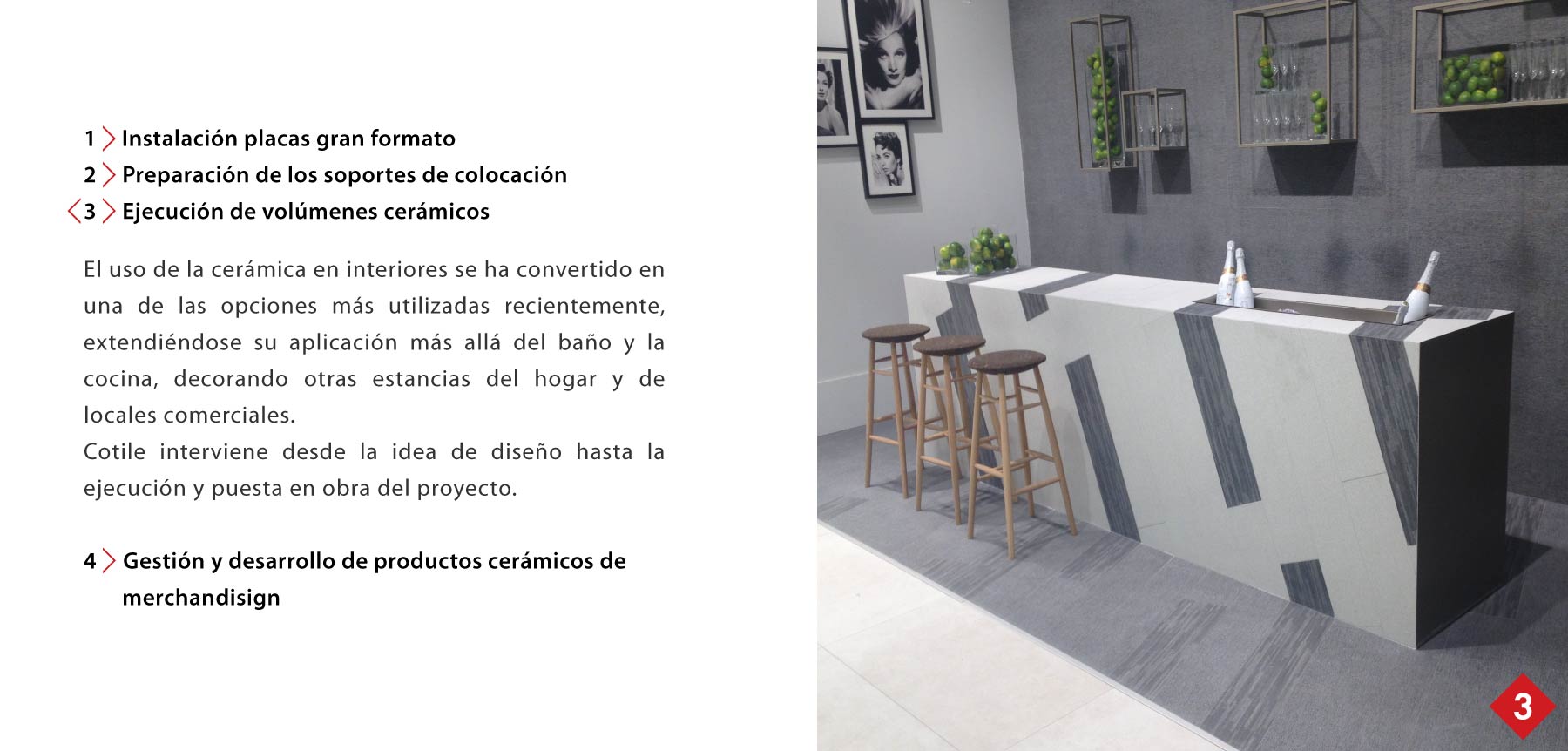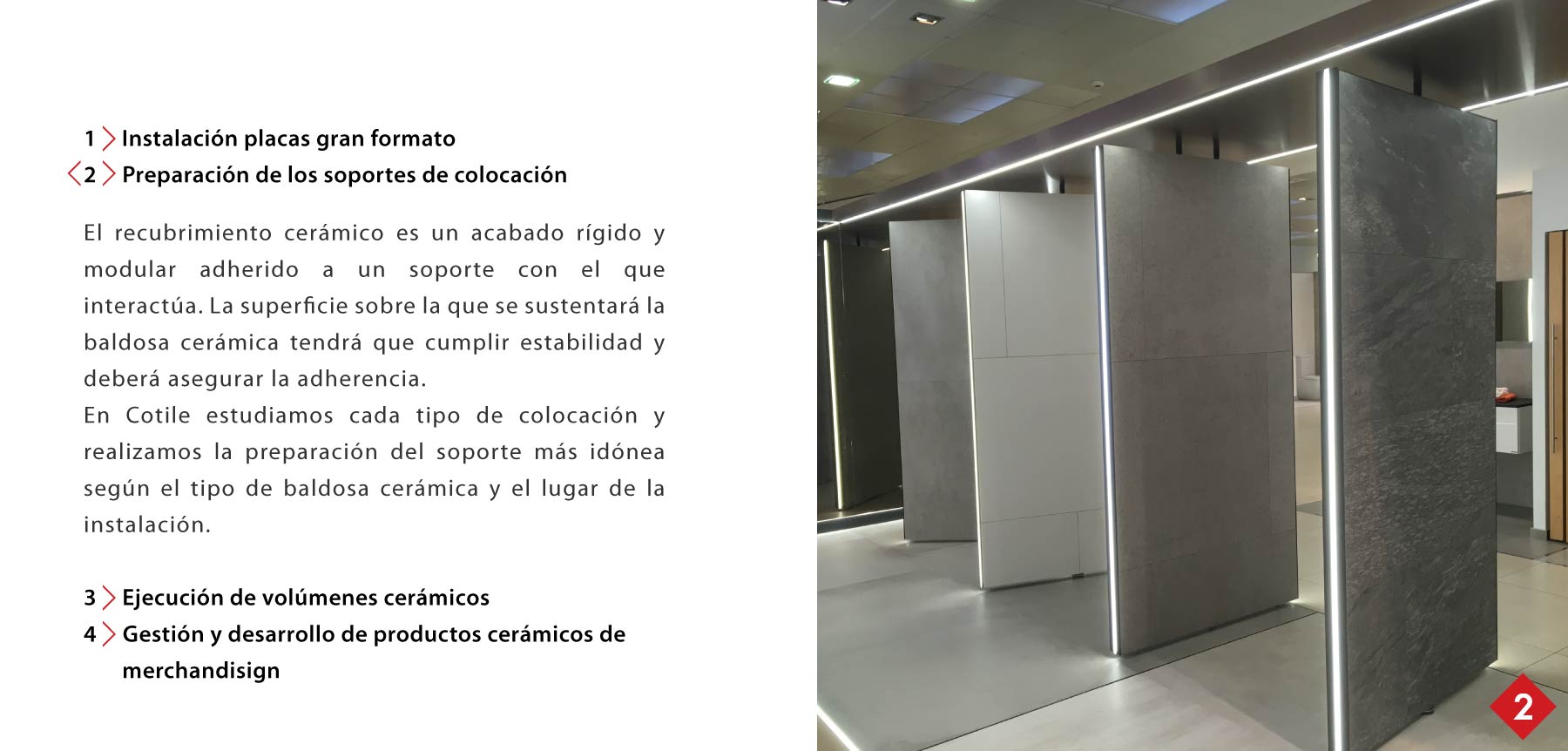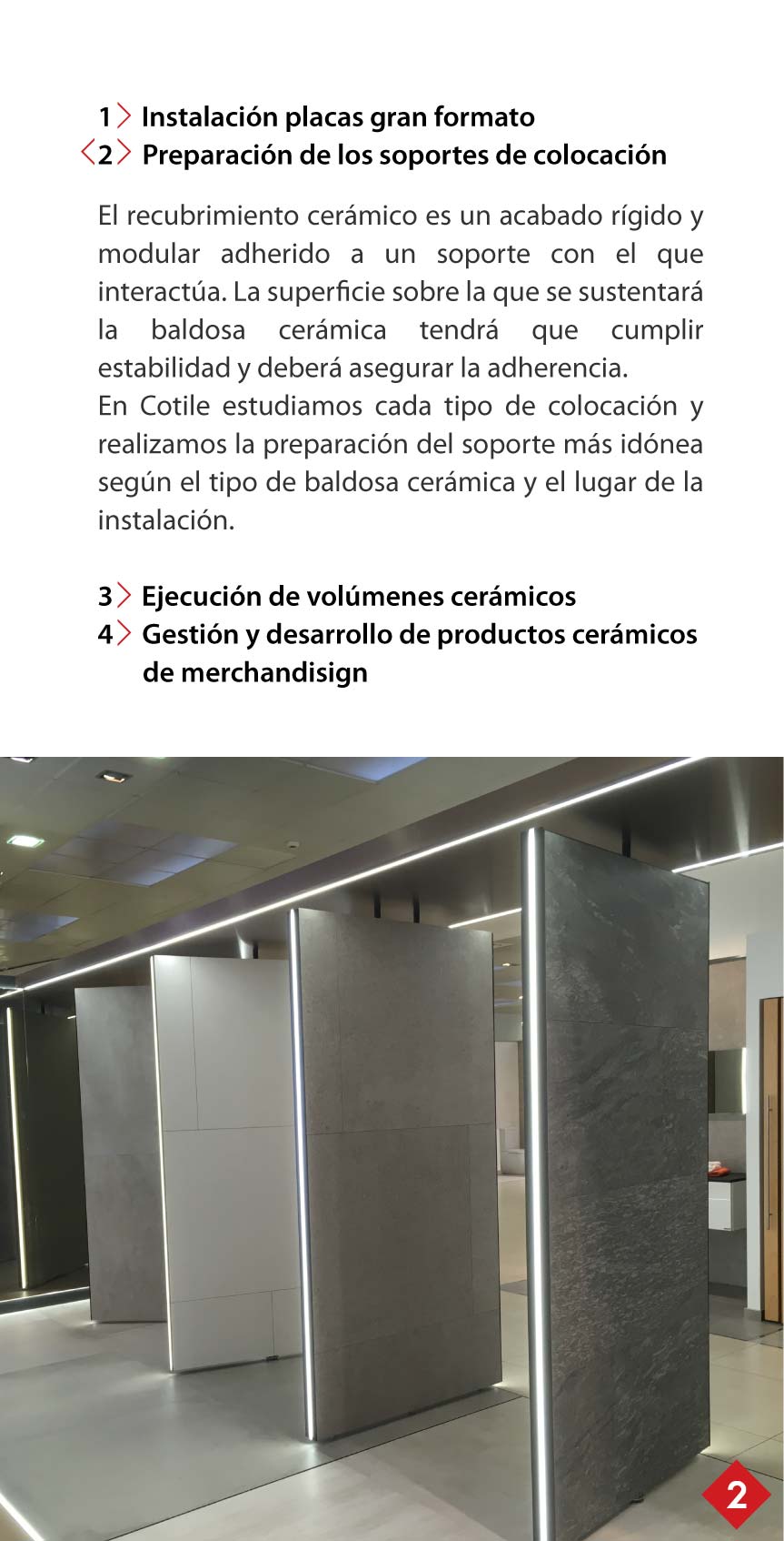 Desde la preparación del soporte hasta el último acabado COTILE ofrece la colocación de toda clase de baldosas cerámicas, gres rústico, gres porcelánico, gres rectificado, placa de gran formato, piedra natural,…