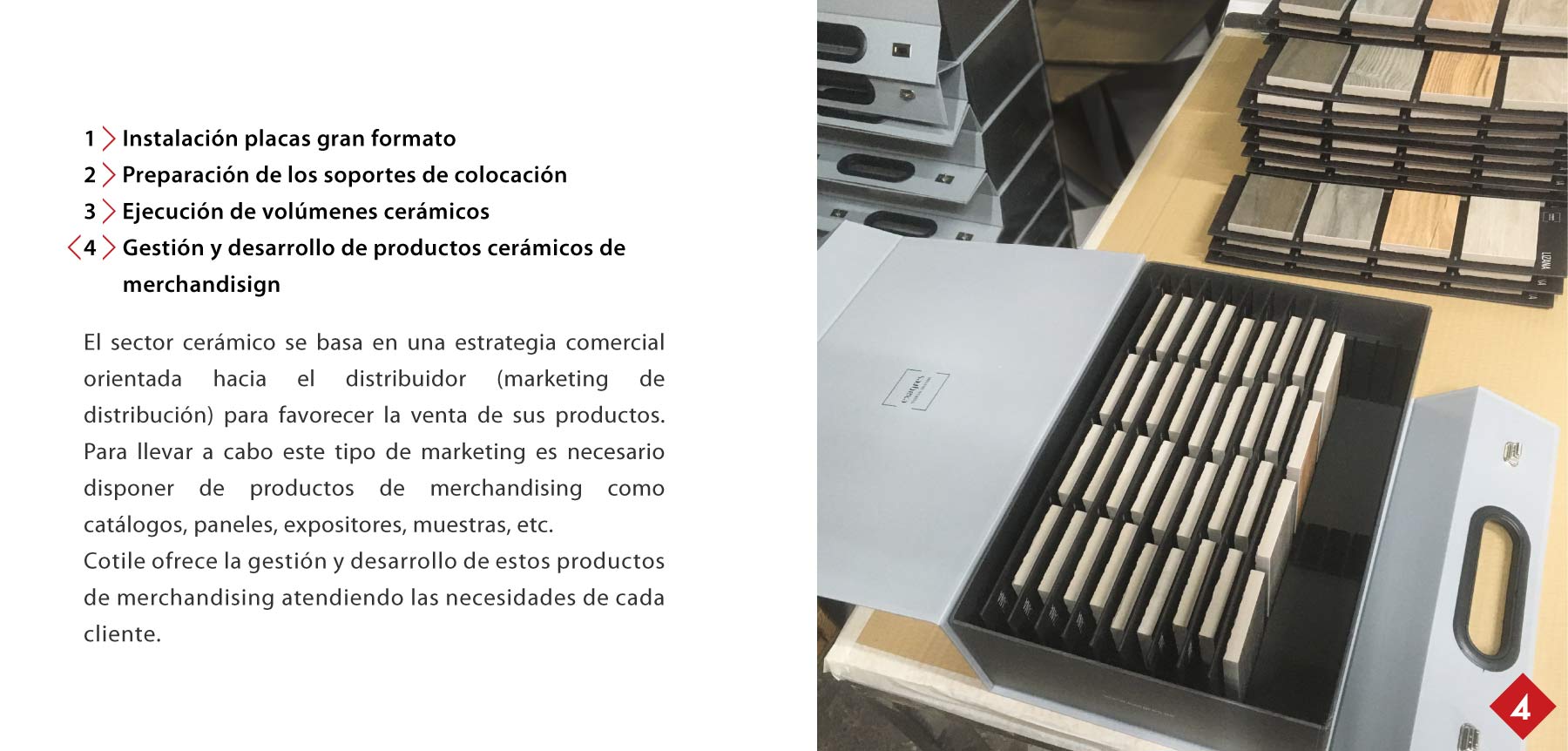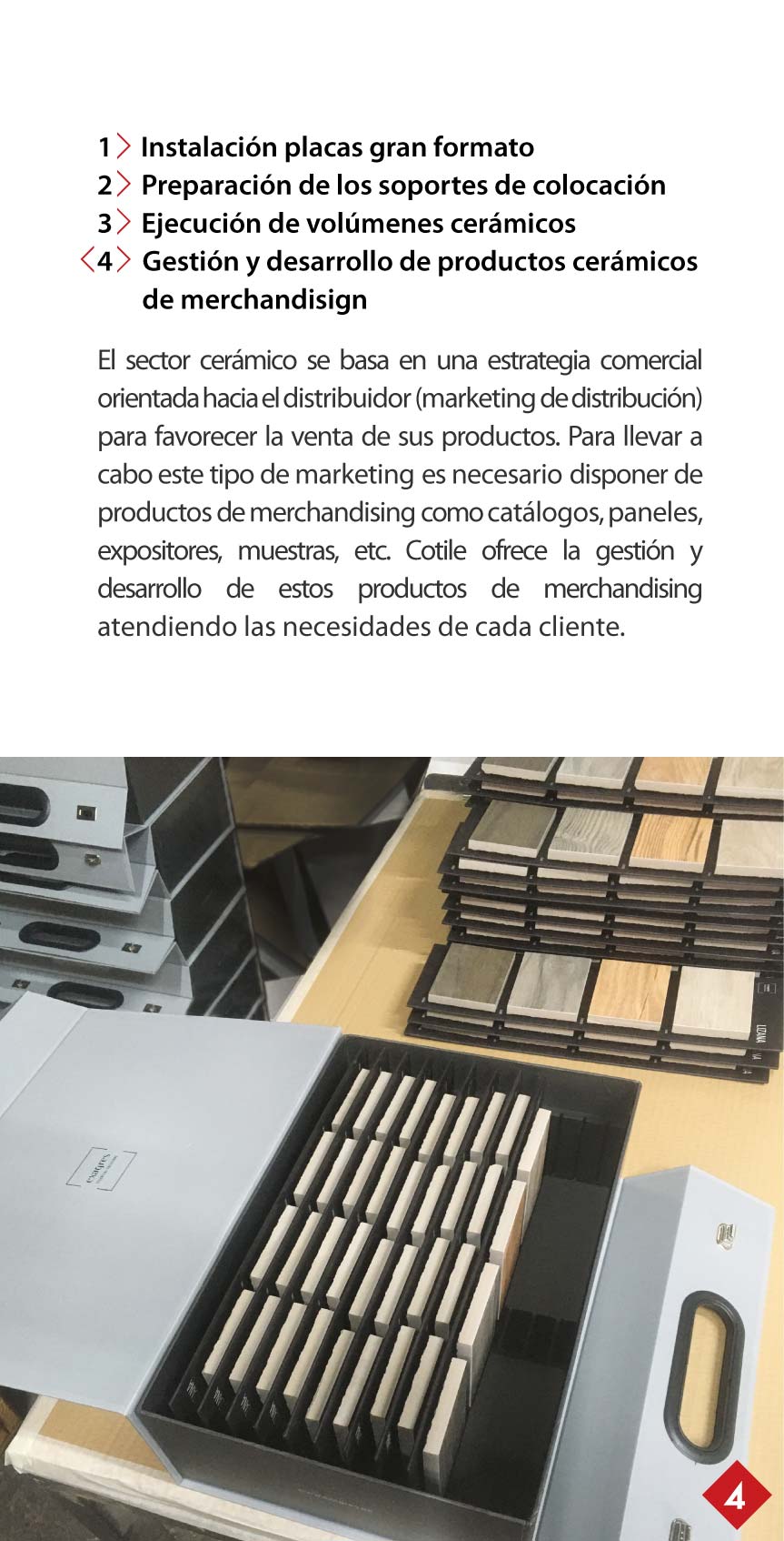Alicatamos productos de merchandising para empresas cerámicas, como son los paneles integrales, paneles de mano. También realizamos cortes de tacos, ingletes, maquetación de carpetas y montaje de volúmenes cerámicos.